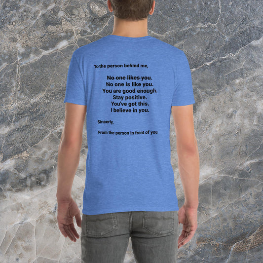 TO THE PERSON BEHIND ME,...(BACK PRINT) (Alternate colors) Short-Sleeve Unisex T-Shirt Gildan 64000